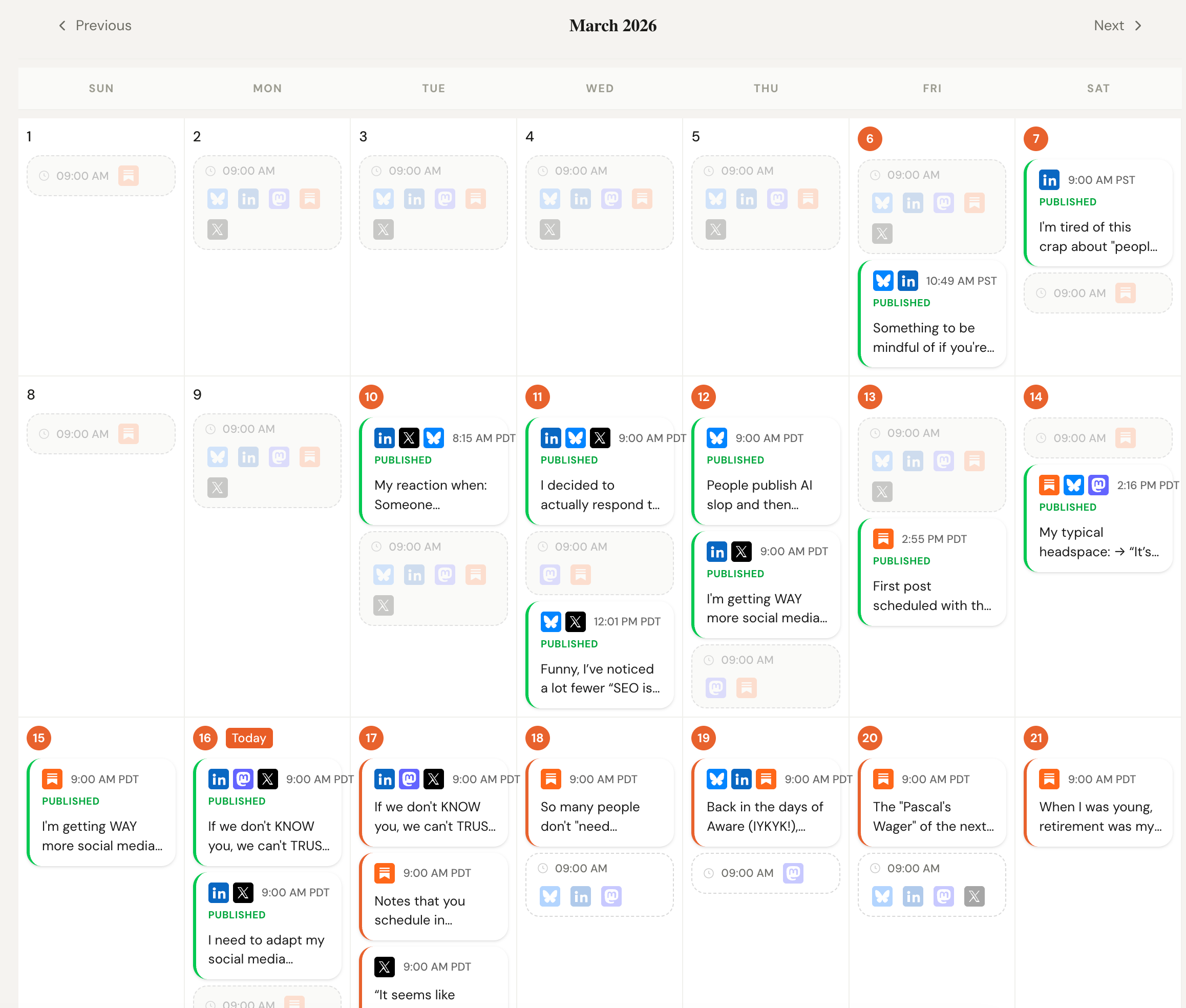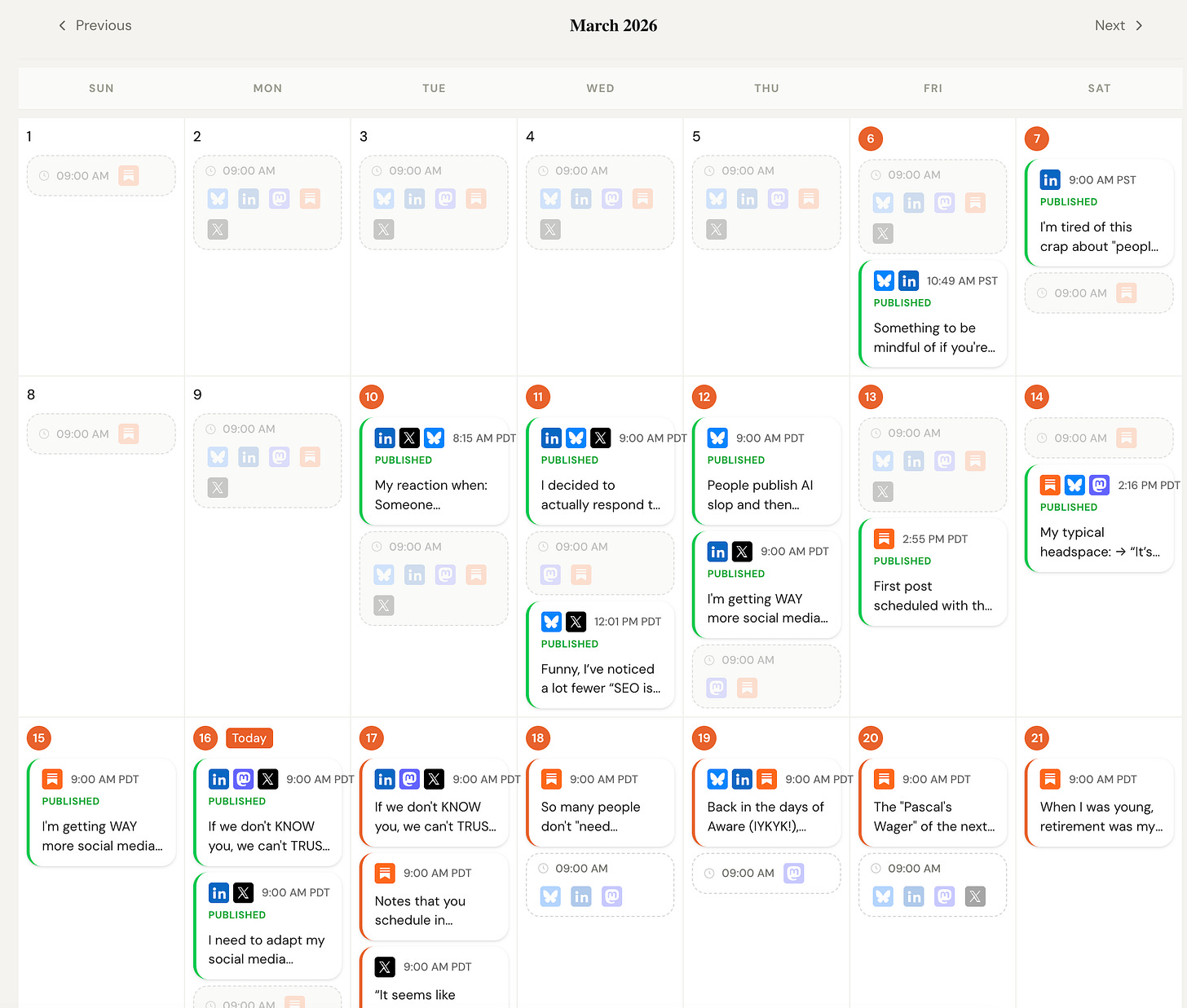 AI defensibility moat. Claude can’t schedule your social media posts for you. Getting all of the details right (formats, platform specific stuff, even just getting approved to use the API) is tricky. And besides, this is one area where a UI does actually help: it’s a lot faster to see, at a glance, whether you have content scheduled for all of your time slots or not.