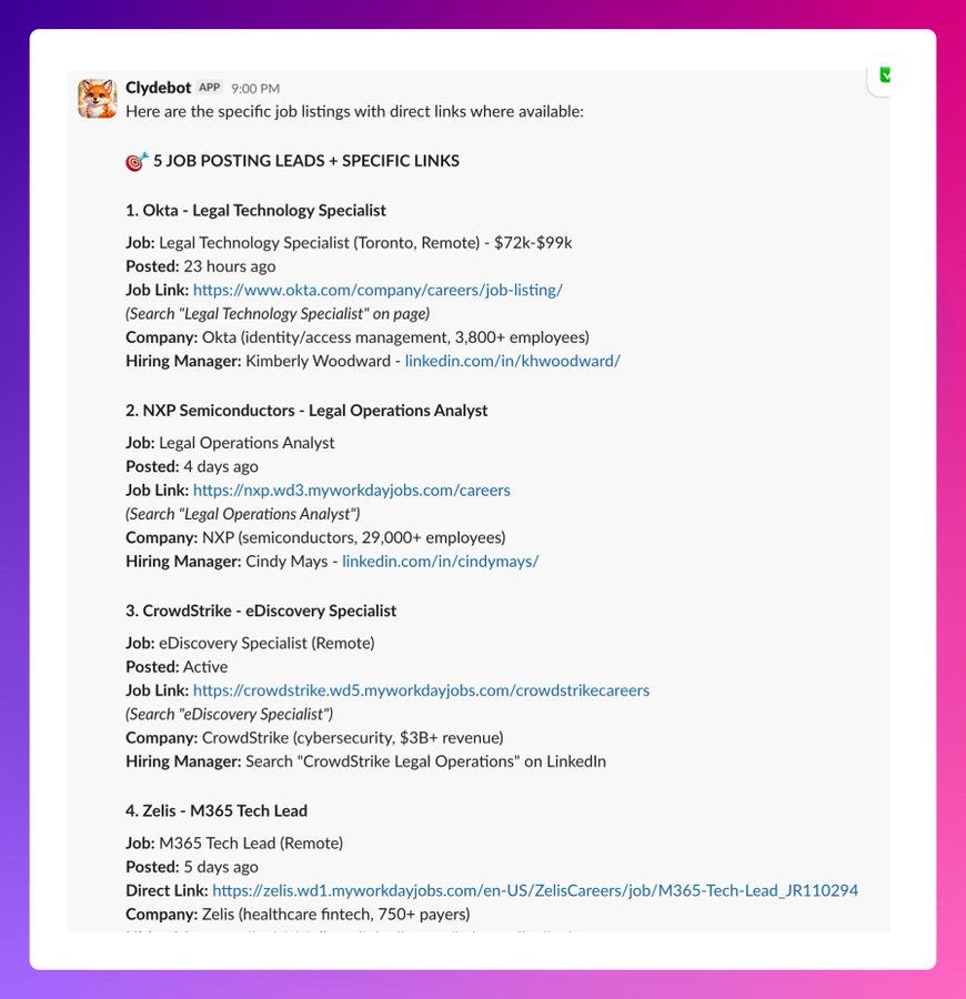 I then asked my bot how we might create good outbound campaigns. It suggested something brilliant: finding job postings mentioning certain keywords related to our tool like eDiscovery and Slack. It finds these job listings, then finds the hiring manager’s LinkedIn profile and information about them. It analyzes their profile and suggests things we have in common along with drafting a LinkedIn connection request message.