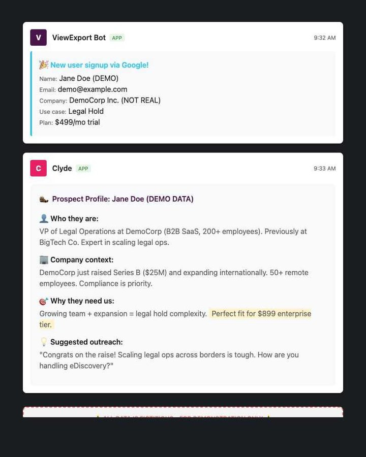 Another thing that’s proving incredibly valuable is for one of our products, viewexport.com. It’s a fairly high-ticket price starting at $499 a month. When someone signs up for a trial, it sends us a notification in our sales channel in Slack with their email and the plan they signed up for.