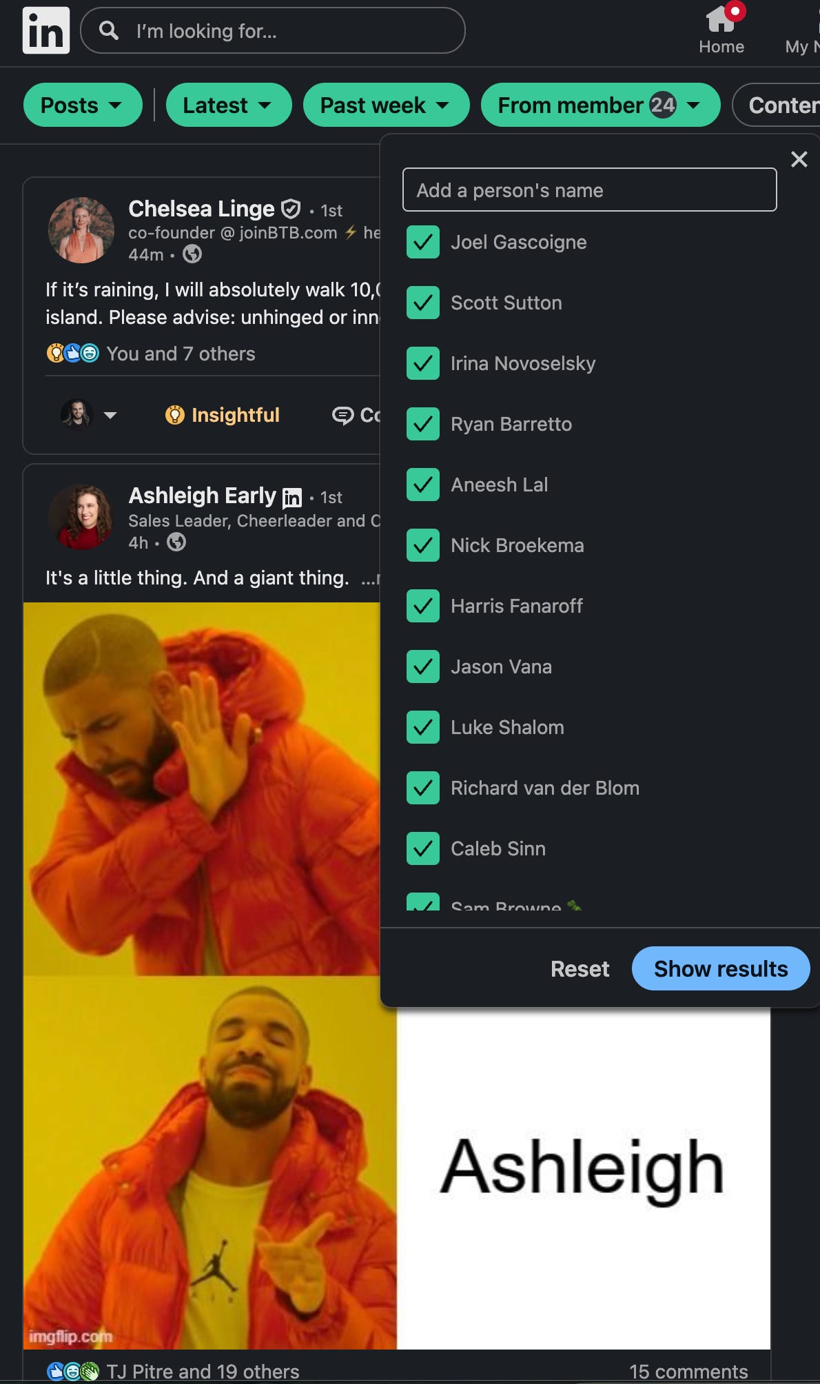 On that page, under “From Member” click “Reset” and then type in the names of the people whose posts you want to see: large competitors, prospects, influencers, etc
